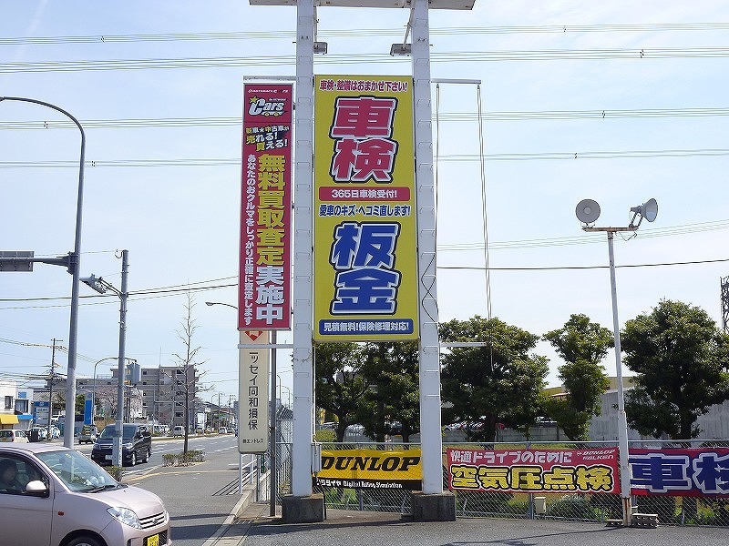 | 業務内容・サービスを前面に打ち出した分りやすい看板です。 車買い取りサービス専門部門の事務所上部に、鉄骨枠+アルミ複合板+インクジェット出力シート4面巻き看板を設置させていただきました。 看板は、壁に付いている様にも見えますが、事務所天井上に乗っているのです。 <北九州市小倉南区葛原:オートバックス小倉南店様> |