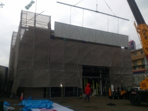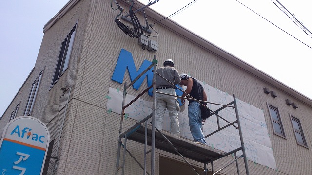 | 大型看板をアルミ複合板で分割製作して、現地でつないで取付作業をしています。 |