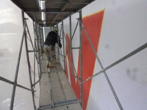 | 壁の上に看板を設置している様子です。 あらかじめ壁に支柱を設置しおき、その支柱に看板をつけています。 この看板ですが完成すると、縦1.5m×横20mになります。 |