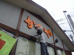 | ひと文字ずつ箱型になった看板の取付はこのようにして、型紙にそってひと文字ずつ位置合わせをして、丁寧に取り付けます。 |