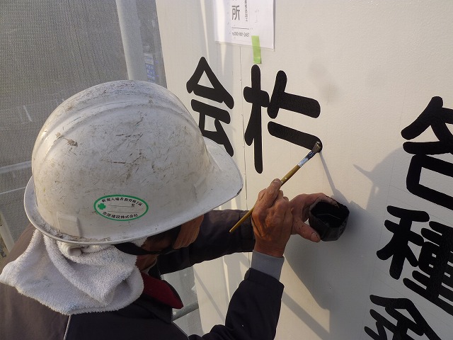 | 工場壁面に大型の「文字書き」施工の様子です。 壁材と外気温度を考慮してムラなく、均一に塗布しながら白い壁に直接書いていきます。 大きい時は、1文字が縦3m程の文字を横幅20m位に続けて書いていくことも行っております。 |