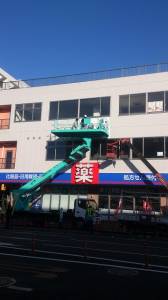 | 屋外広告物条例に基づく点検を毎年行わせていただいております。 高所看板は特に、日頃、目で点検できないので、高所作業車を用いてこうして重点点検を励行して、お客様、店舗様の安全を守っています。 |