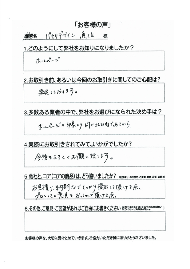 この度はアンケートご協力いただきまことにありがうございます。これからも迅速な対応をさせていただきますので、今後ともにどうぞよろしくお願い申し上げます。